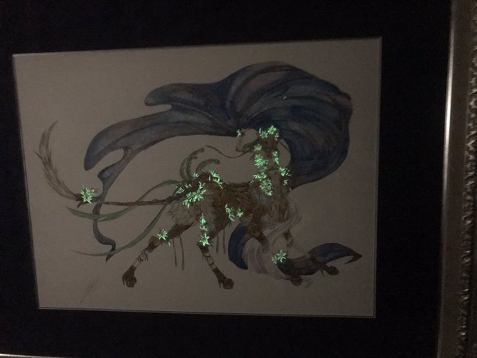 シャムシール君の「演目 百合の舞」がたまらなく…綺麗で……しかもちょうどお客さんがいない時だったので特別になんと在廊中の樋上谷さんのご好意でなんと電気消して頂き生で光るシャムシール君を拝む事ができましたなぁぁむちゃくちゃ素敵で綺麗で言葉失って…むちゃくちゃ楽しめました♡ #幻獣展3