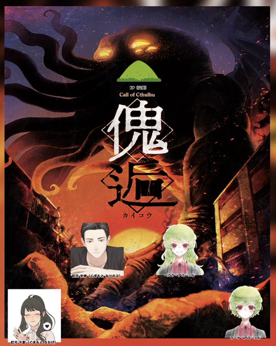 傀逅 生還エンドだよやったあ!!! 詳しい事は伏せったーで話しますがめちゃくちゃ面白いシナリオでした!ありがとうございましたm(*_ _)m KP・・・やまちゃん Pl・・・きょむちゃん、私