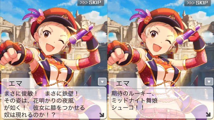 エマのシューコリングコール時に登場する「花明かりの夜風」「ミッドナイト」「舞娘」って全部周子のSRの名前の一部ですかね [花明り夜風]、[ミッドナイトフェアリー]、[湯けむり舞娘]