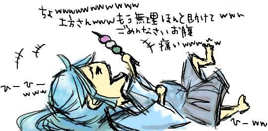 もはや跡形もなく崩壊したヒジー【跡形もない土方】を見て腹筋崩壊な沖田様w そしてお茶噴射ちゅけと沖田さんの間にステキ絵師N様が超めんこい崩壊フェイスなムウを描いて下さりました(*´I`*)いつも絡んで頂いてありがとうございますん!!