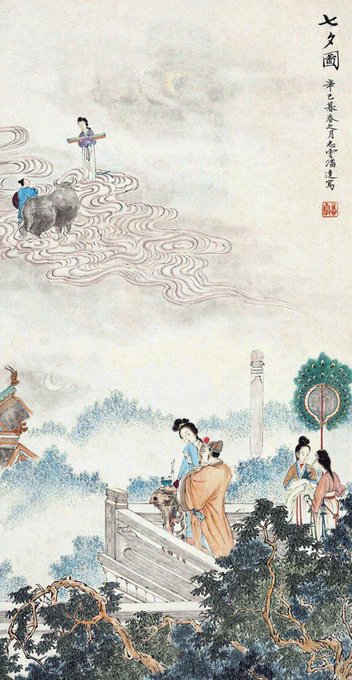 晚來橋上千般語,對望桃花敍舊情。願我如星君如月,流光皎潔踏歌行。 #Chinese #painting #art #QiXi