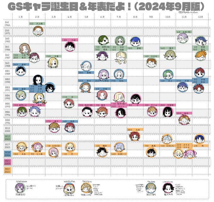 GS年表修正版 1枚目が顔付き(生年月日が不明な人物については表の下に移動しました) 2枚目は文字のみシンプルバージョン ※自分用メモなので間違いがあるかもしれません。ご了承ください