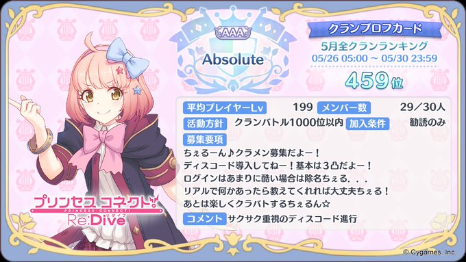改めて募集します! ☆サポ借り3凸 ☆ディスコード必須 ※VCは使ってません ☆フルオ、セミオ可 ☆連携有(初心者歓迎) ☆楽しくゲームする! 他不明な事はなんでも聞いてください! #プリコネRクラメン募集 #プリコネRクランメンバー募集