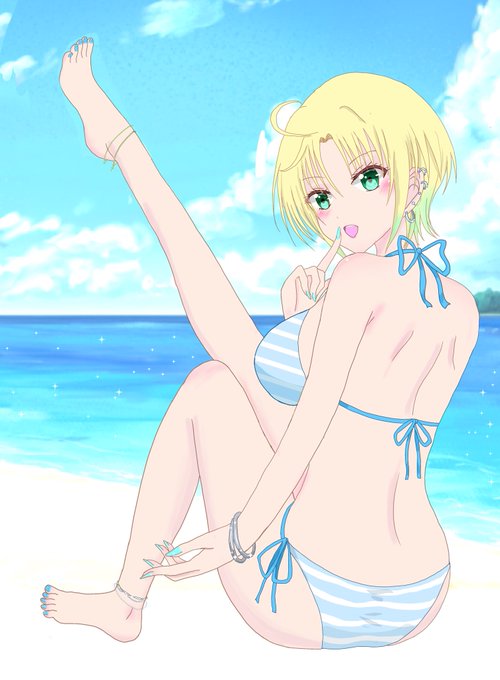 はるか「ウチのプライベートビーチやで(*´˘`*)♥🏖今日はおニューのボーダー柄の水着を着てみたの😉💕海を見てると癒されるし、落ち着くのよね♪」