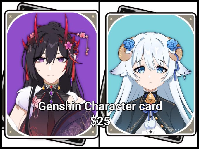 Hi!!! people are asking me who did mine so its @Katsumissan They are currently opening Genshin Character Card of your OC in it for 25$ 😭❤️ its such a steal! I wanna see all those vtube babes and ocs as GI char!!