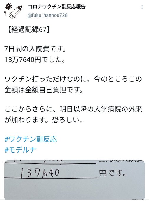 今日の突っ込み ワクチンは無料でも、その後のケアは自己責任。 病院はワクチン利権と副反応入院でWゲット。 #コロナ #ワクチン副反応 #入院費 #自腹 #タダほど怖いものはない #柵の中で眠った羊の一幕 #利権だらけ