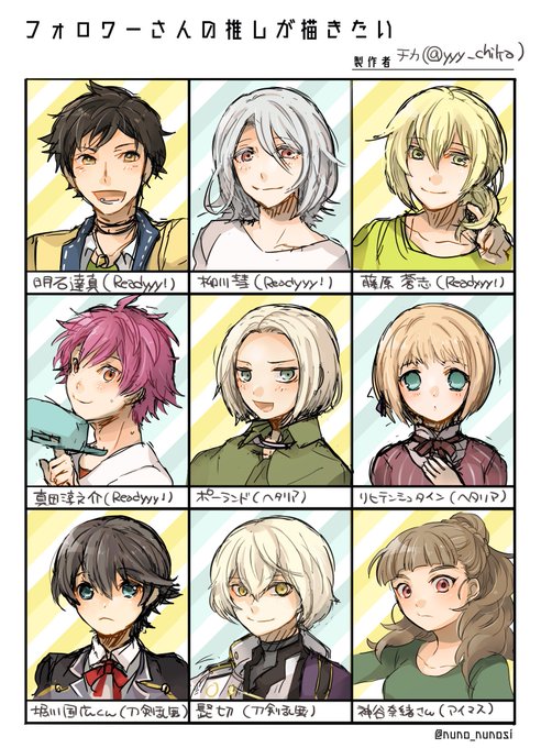 アフターの名札に使った子たち~!もち米さんがおっしゃってくださったので、嬉しがってまとめてみた!さもぴ初描きだったんだけど、一応描いた時点ではサービス中だったので全キャラ制覇できて嬉しかった