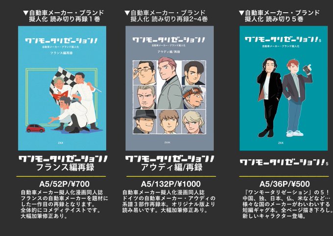 車メーカー擬人化、ワンモータリゼーション全冊揃ってます。よろしくお願いします。 【擬人化王国21】サンプルとおしながき【西2-フ48b】 | ズーくん #pixiv https://t.co/8sjqbqDnWU 【通販】→ https://t.co/rWW5t0UsYk #擬人化王国 #自動車メーカー擬人化 #ワンモタ