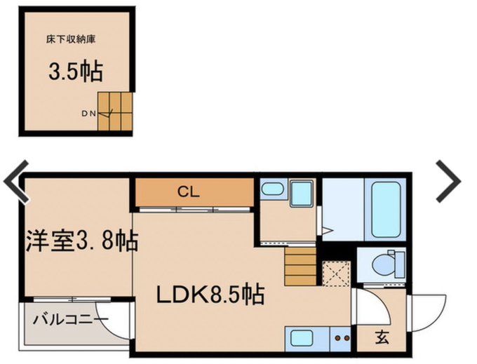 ほんのちょっとだけ迫り上がってる3.8帖の下が床下収納という名目にされてる賃貸