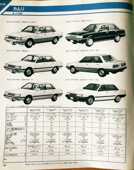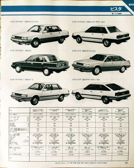 昭和60年10月発行「自動車ガイドブック」の乗用車紹介よりトヨタ車。「ビスタ5ドア2000VFターボディーゼル」乗りたいです! #昭和レトロ #旧車 #カムリ #ビスタ #コロナ #カリーナ