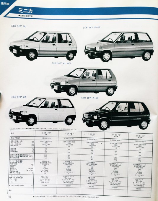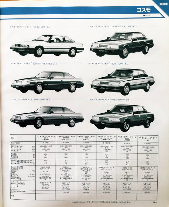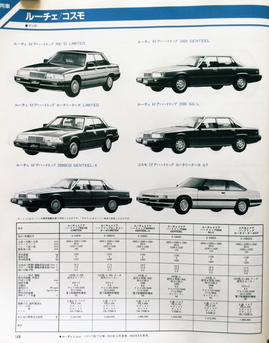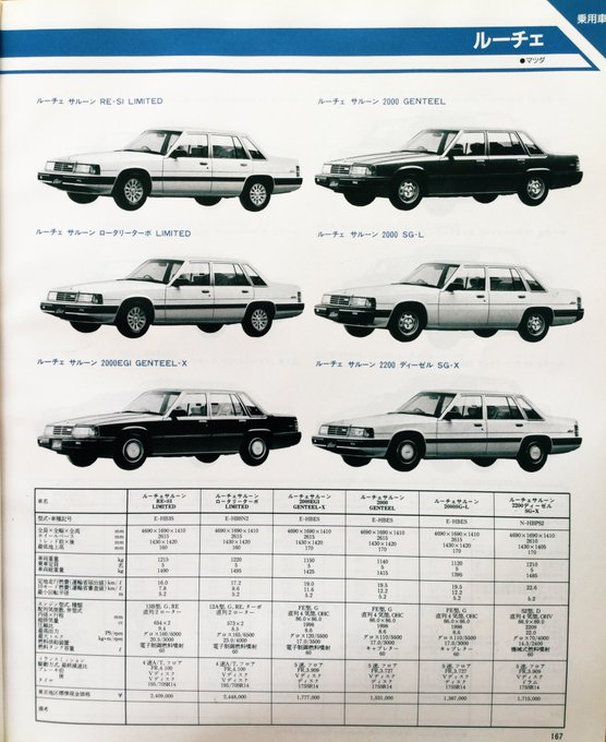 昭和60年10月発行「自動車ガイドブック」の乗用車紹介より三菱車とマツダ。『ロータリーターボ』車が多い事に気が付きました。当時のマツダ車の特徴だったのかしら? #昭和レトロ #旧車 #ミニカ #ルーチェ #コスモ