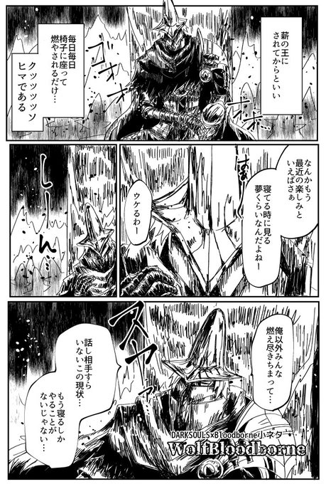 冬コミにだす不死隊本のギャグパートのちょい出しです。ブラッドボーンとクロスオーバーしてます!まさかの悪夢に薪の王の不死隊の運命やいかに!!な内容ですがお察しですよねもう!