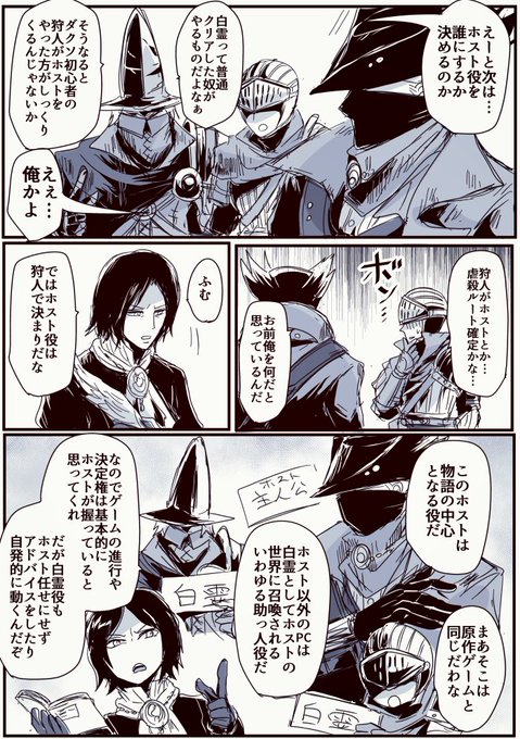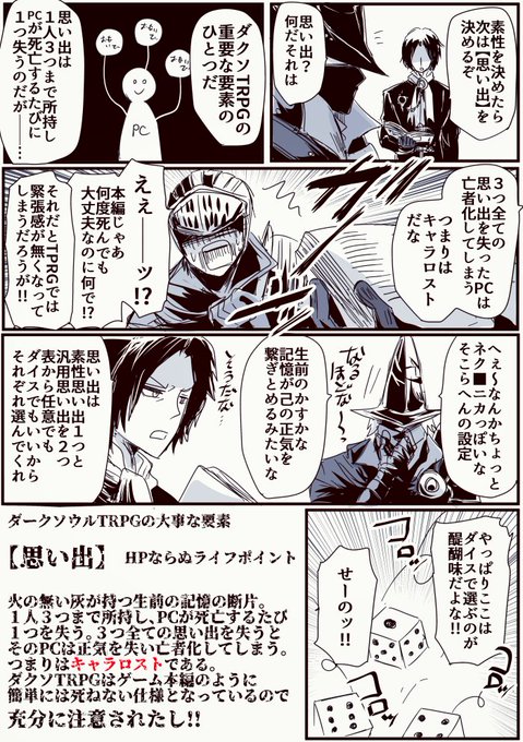 ダクソTRPGの理解できた部分だけ漫画にしてみました。キャラ作成は最初は出来合いのサンプル使用がイイかと思います…そして思い出表がツッコミどころ満載の内容なのが腹痛いです(爆笑)一応ルルブ読んだ限り仲間同士の繋がりはこういう認識ですが間違い等あったら申し訳ないです。