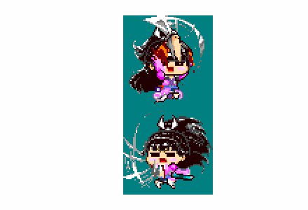 (//”≡◡≡”)φ ジャンプ上昇・下降アニメーションができました♨ 上昇中(斬り上げ)は上方向のオブジェクトを叩き、下降中は(斬り下ろし)足元の敵を切って再ジャンプするという某マリオ準拠になる予定です。…この頭身のキャラが頭の上までそろえた手を振り上げるの無理があるなあ💦