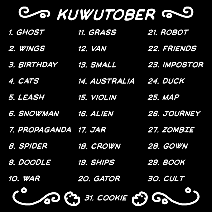 Thread of my Kuwutober drawings so far!! Prompt list made by myself inspired by @Cowokie1 !!!
