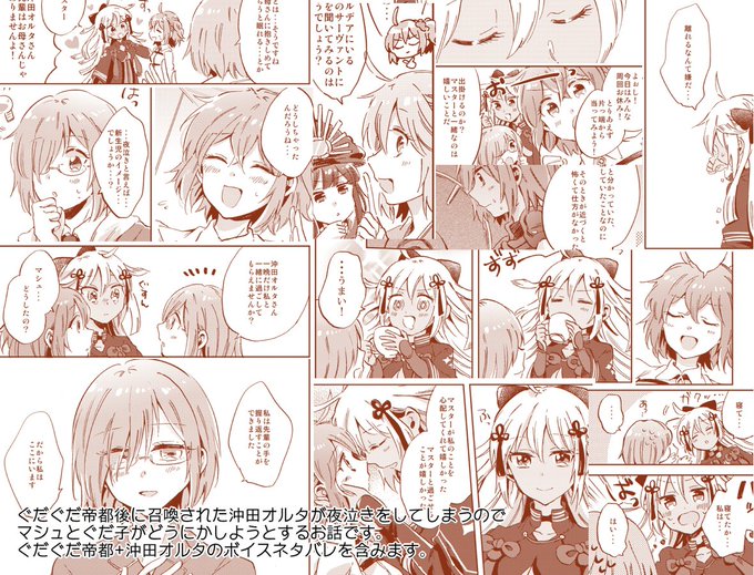 10/7スパーク新刊サンプルです!沖田オルタちゃんの夜泣きが止まらないのでぐだ子とマシュがどうにかしようとする話です。B5/P40/¥500 ロ49a「ざわめきじゃんぼ」です。よろしくお願いします!