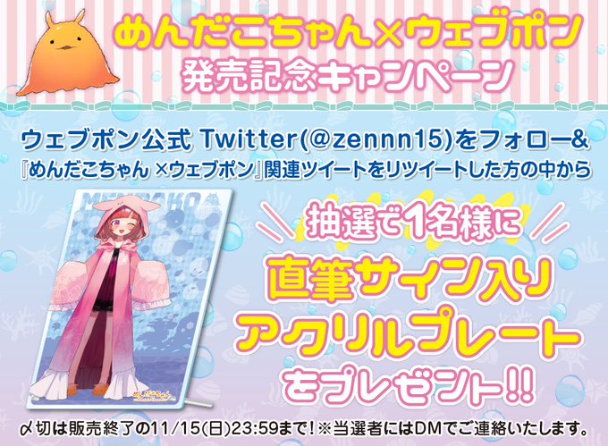 『めんだこちゃん×ウェブポン』が11/6(金)12:00〜発売決定!!ウェブポン限定グッズがハズレなしで必ず当たる!10日間限定販売なのでお見逃しなく!直筆サイン入りアクリルプレートが当たるキャンペーンも実施中!!詳細→https://t.co/l18BbdE6Eg #めんだこちゃん #ウェブポン #めんだこウェブポン