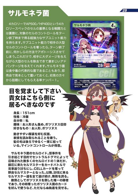内容は、CELLのご紹介、世界観とストーリー、開発者インタビュー、描き降ろしカラーイラスト&キャラクター紹介、ピックアップカードガイド、コンボガイド、デッキレシピ、用語集、Q&A、全カードリスト、4コマ漫画、コラム、他、です