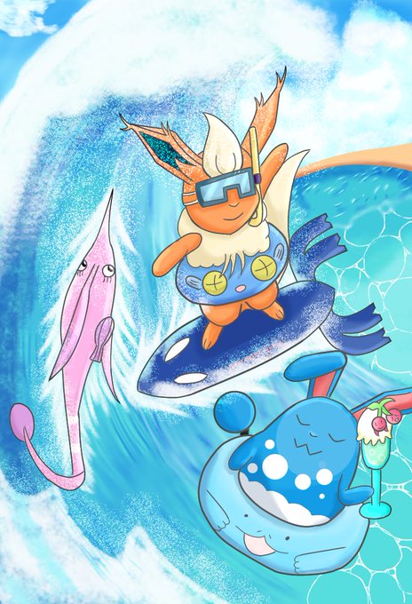 海の日と思って間に合わなかった絵でございます 波凝り過ぎたけど凝った割にはそんなに上手くない気がする(汗) #ポケモンイラスト #イラスト好きさんと繋がりたい