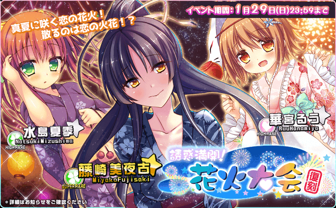本日1/20(金)より復刻イベント「誘惑満開! 花火大会」を開催いたします! 浴衣姿の女の子たち……ムラムラしますね! イベント特攻ガチャも同時スタートです! https://t.co/wpBxsxRTM8 #ぜったい遵守