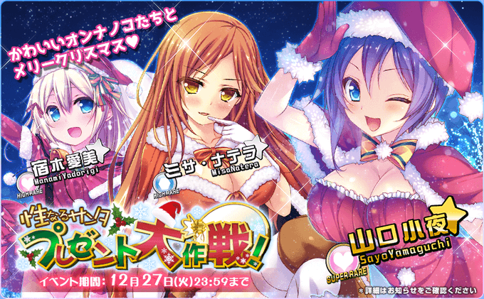 本日より新イベント「性なるサンタ プレゼント大作戦!」を開催いたしました! 街も白く染まりそうです! イベント特攻ガチャも同時スタートです! https://t.co/wpBxsy9vaI #ぜったい遵守