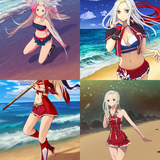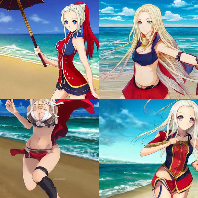 #stablediffusion 画像参照なし「水着エーデルガルト」指定で一部のパラメータを調整した出力結果、実に凄すぎる……特に最後の一枚が気に入り。ガチャを引くよりAIをいじるほうが面白いと感じる。