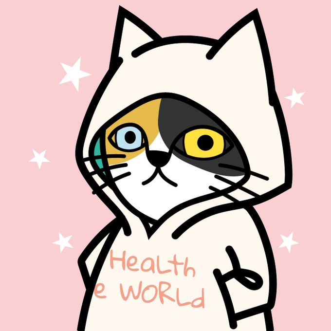 👉「heal the world」(世界を癒す)ではなく「health e world」(健康e世界)など残念ロゴパーカー猫達です