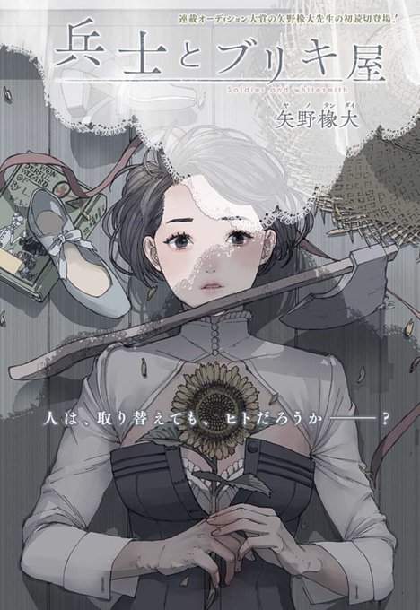 片方がカーテンに隠れた銀の靴、麦藁帽子、斧、胸(心臓)に抱いた向日葵、ブリキ屋と、「オズの魔法使い」が下敷になってるのね カーテンの不自然な影で表された白黒はどういう意味があるんだろ #ジャンププラス #兵士とブリキ屋