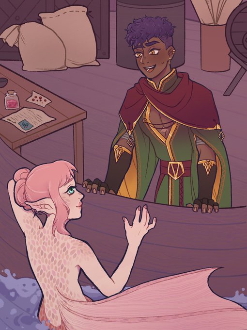 A late bday gift for my friend, merm (Verity) belongs to me and Dhatri belongs to them! A fun mermaid x traveling merchant au 💕