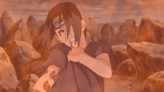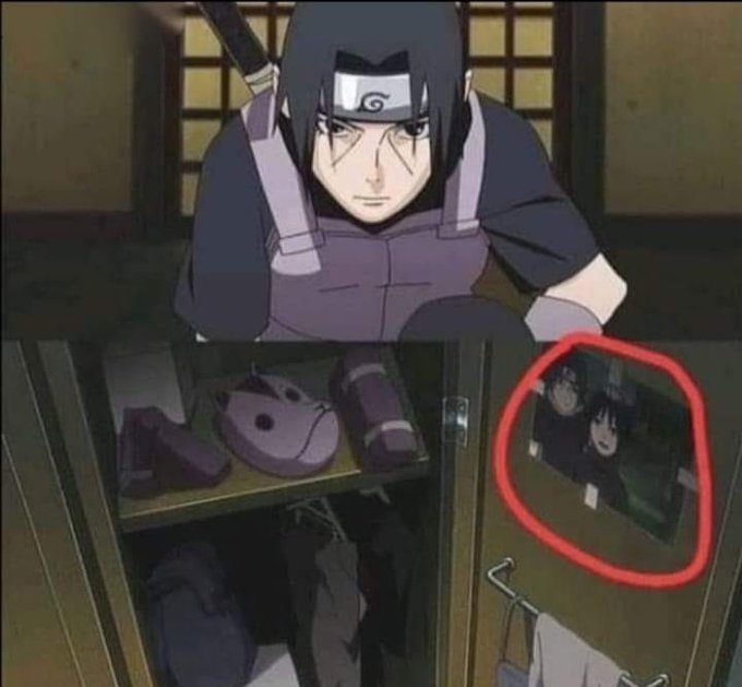 photo: "Find the mass shooter, easy mode" & also "find the reason" bc who the fuck leaves his newborn in the hands of his 5yo during a monster attack? & only shot of adult Itachi with his hair down. Kabuto is so fuckn creepy, to put Itachi's necklace on him & do Deidara's hair.