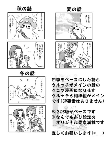 クルッチ、相棒組中心の四季をベースにした話とクルッチが中心の話の4コマ漫画になります。