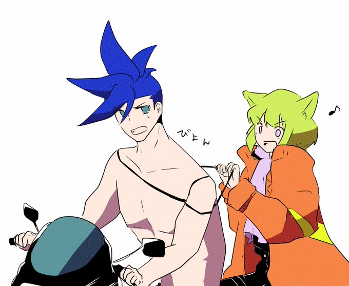 anyway Lio riding on the back of Galo’s bike with the Matoi, Lio with furry ear, shirtless Galo wearing Burning Rescue jacket, FURRY LIO RIDING ON THE BACK OF GALO’S BIKE