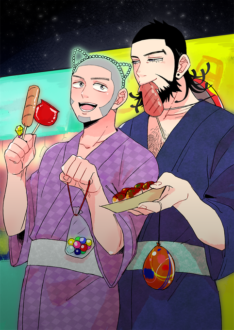 お題箱より『盆踊りの屋台で楽しみすぎているキロ白お願いします。二人共浴衣で、りんごあめわたあめたこ焼き焼きそばヨーヨー、スーパーポール釣り...何するんだろ♥』