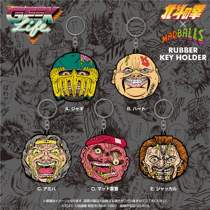【マッドボール×北斗】世紀末に散った北斗の卑劣な漢達。世紀を超え奴らがマッドボールで蘇る!!怨念たっぷり第一弾は、ジャギ様、ハート様、アミバ、ジャッカル、マッドサージの5人。先ずはラバーキーホルダー。貴方は誰を選びますかぬァ?さっさと選ばんとォ・・・https://t.co/XlPySHMqMX #北斗の拳