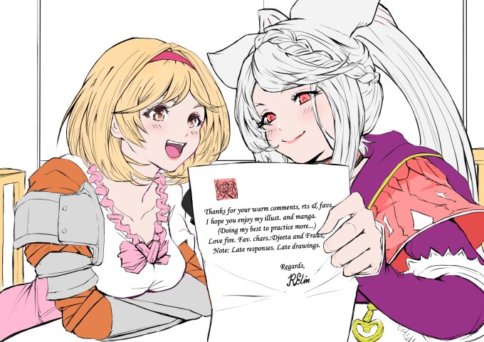 my sona addie drawn by him, and his sona, baran drawn by me!