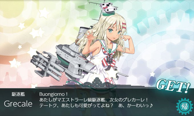 出たーーー!グレカーレ!51出撃目A勝利にて!艦娘再コンプ完了です!