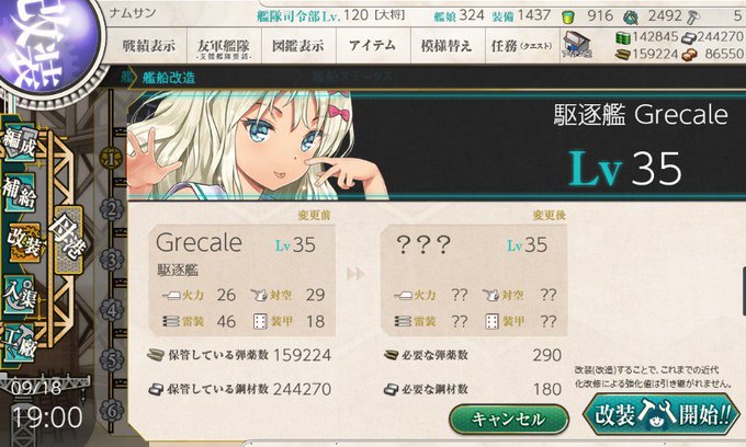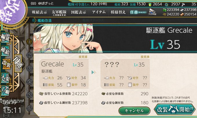 イージス海防艦御蔵ちゃんの奮戦によりグレカーレがLv35へ到達。改造へ・・・しばらくは4-4の旗艦へ据えて育成し適当なとこでブルネイへ突っ込むとしましょうかね!