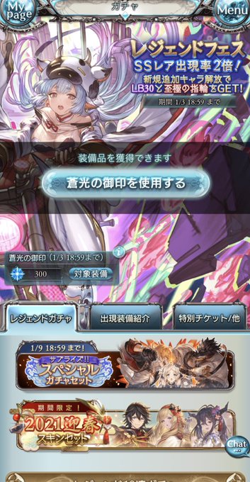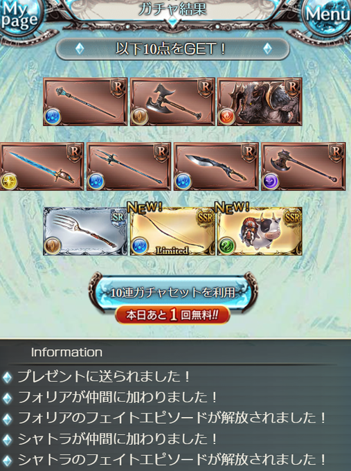 グラブル無料ガチャ。ガチャピンとムックモードの20連から240連足して天井。SSRは17、新規は9
