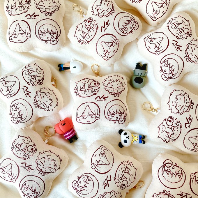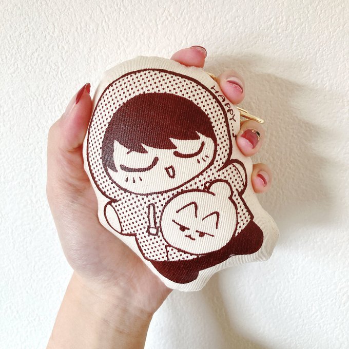 クッションキーホルダーとクラフト紙のステッカーつくりました🥳クッション思ったよりだいぶおっきい!そしてコットン生地にシルクスクリーン印刷でかわいい〜☺️ 3枚目は自分用につくったしゅ~さんと猫バージョン🐱