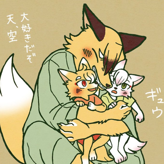 描き方が違いますけど、1枚目 この真ん中で「ふえ?」ってしてたのが、2枚目 大人になって子ども達をギュウってしてる。ここまで成長してるんですわ😭#子ぎつね天空