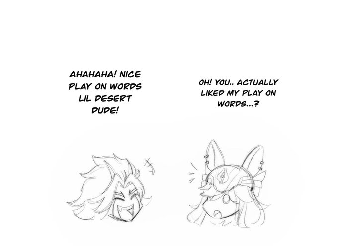 I honestly, think they would be good friends lmao. Cyno needs to make a trip to Inazuma or Itto needs to go to Sumeru so they can play games together 🥲 props to my wifey @Mekaga_draws for "lil desert dude" lmao