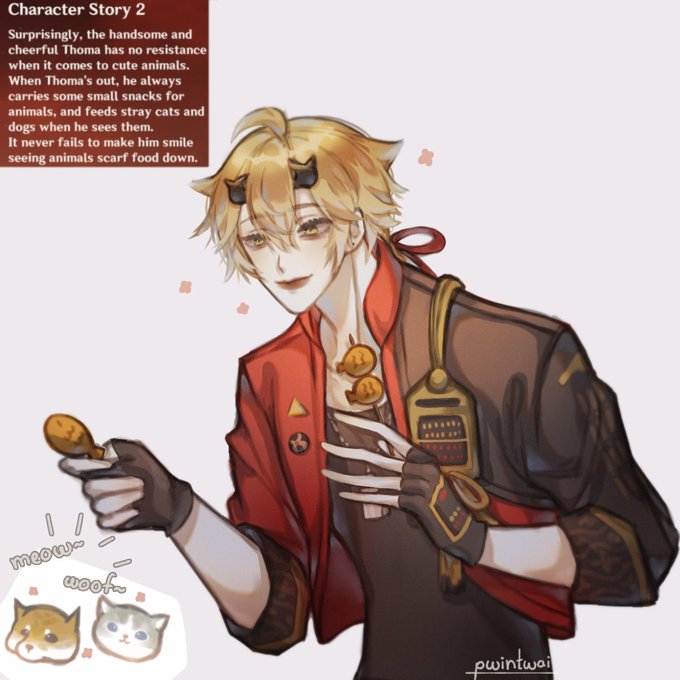 In the residence of the Kamisato Clan you can see two paintings representing cryo (probably Ayaka) and hydro (Ayato) as two powers of Kamisato Clan. SO I use hydro painting as a background here to show how Thoma is surrounded by a domineering Young Master 🤭
