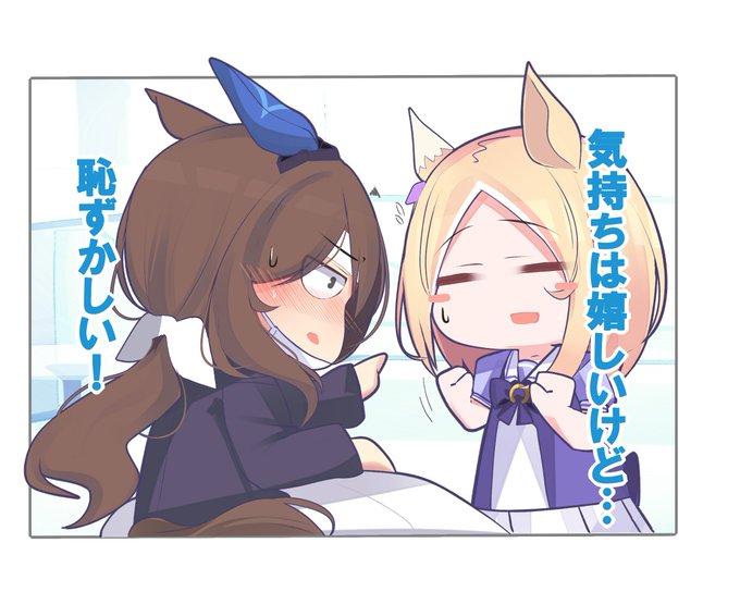 自分の意志とは相反することを言われ、納得はしていないけどトレーナーのいうことは自分を思ってのことだと気づき反論したいけど嬉しくなって照れながら反抗する姿勢は見せるが尻尾がブンブンするトプロ描きました。 リアル事情ボロボロですが、なるべくお絵かき頑張ります。 #ウマ娘プリティダービー