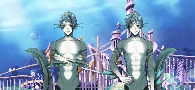 こないだ🦈くんの腹チラを描きながらハッとしたんだけど、人魚フォームの時おヘソないんだね⁉️人魚チャンたちのおヘソが見られるのは人間になってるときだけ…ヤダなんかエッチッチ🤭❣️❣️(2枚目はモブ人魚だけど彼らにもない)