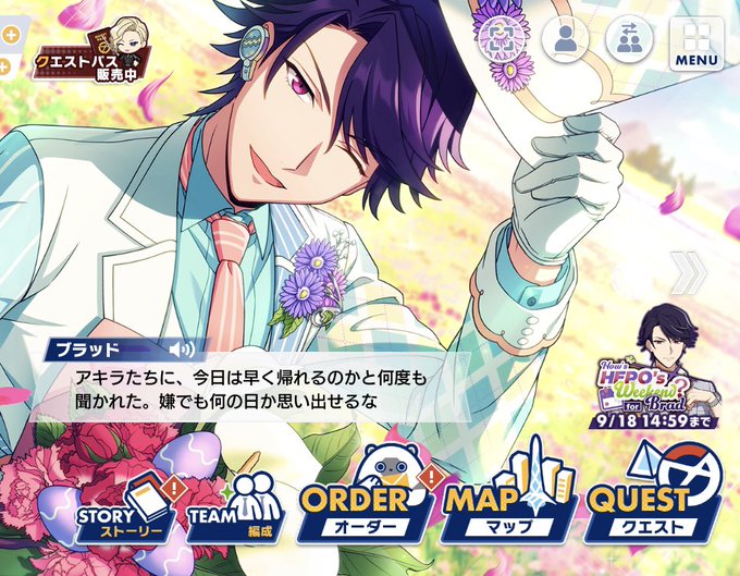 September 15th is the birthday of Helios' japanophile mentor leader, Brad Beams (cv. Wataru Hatano). His birthday party is tonight. It seems he's actually clearing space in his schedule to play with companions♪ https://t.co/3ga8Y5sTka