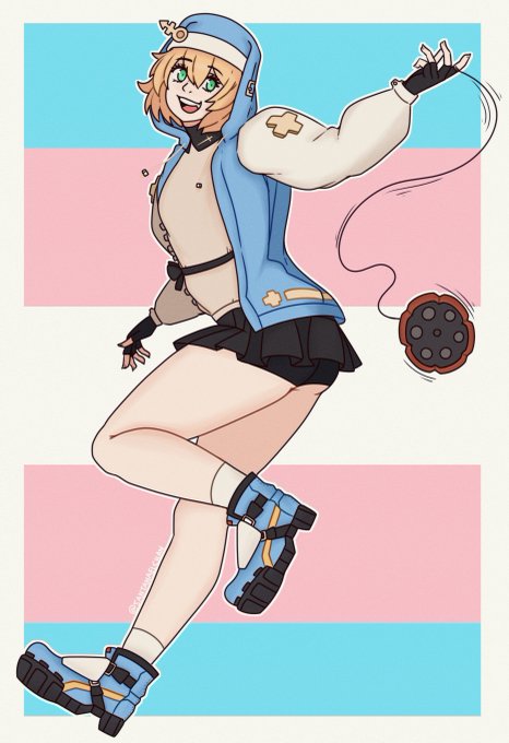 @gatofruit @CommonTransWs Bridget looks like this, and from a game series called Arc SystemB Works's Guilty Gear. Its from the UK, also Bridget is trans :)
