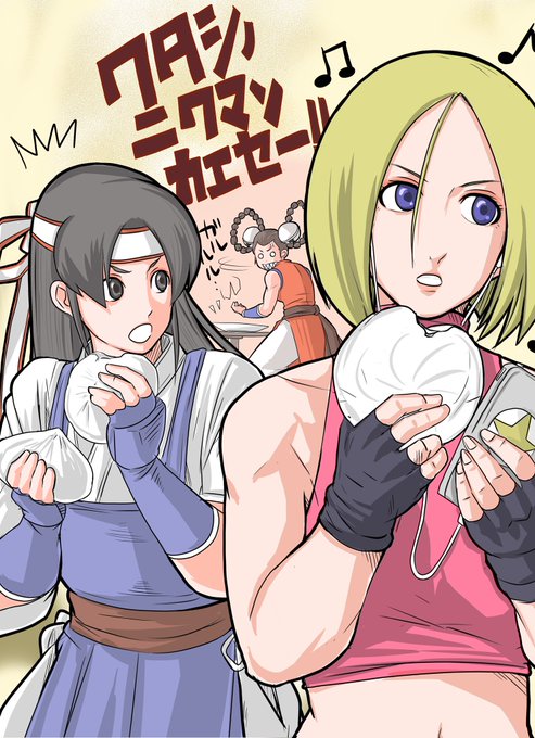 描いててよくわからなくなって来たけど、肉まん取られて怒ってるシャンフェイさん。99のチームなのにキング忘れてた。あと、ニクマンがニワマンに見える。 https://t.co/C09munR81T