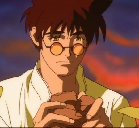 The man eating a leaf in this famous gif, is actually the protagonist Nekki Basara from the hit 1994 mecha anime Macross 7! He is a mech pilot and a rock singer who owns the band "Fire Bomber." Basara greatly enjoys hot dogs and