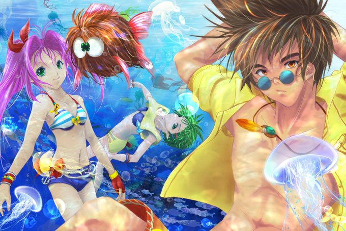 @ekitai_soup この絵のクラゲはブラシぽちっと置いただけだし、背景も基本は素材でそれに幾つか合成したり。泡も魚もブラシでさーっと描いてちょい弄ったりするだけよ〜。