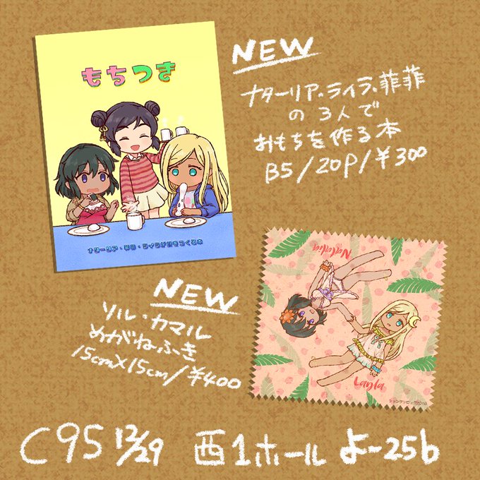 新刊はナターリア・ライラ・菲菲がお餅を作る本です!ソル・カマルのめがね拭きもあります~!一日目ですがぜひお立ち寄りください~!!